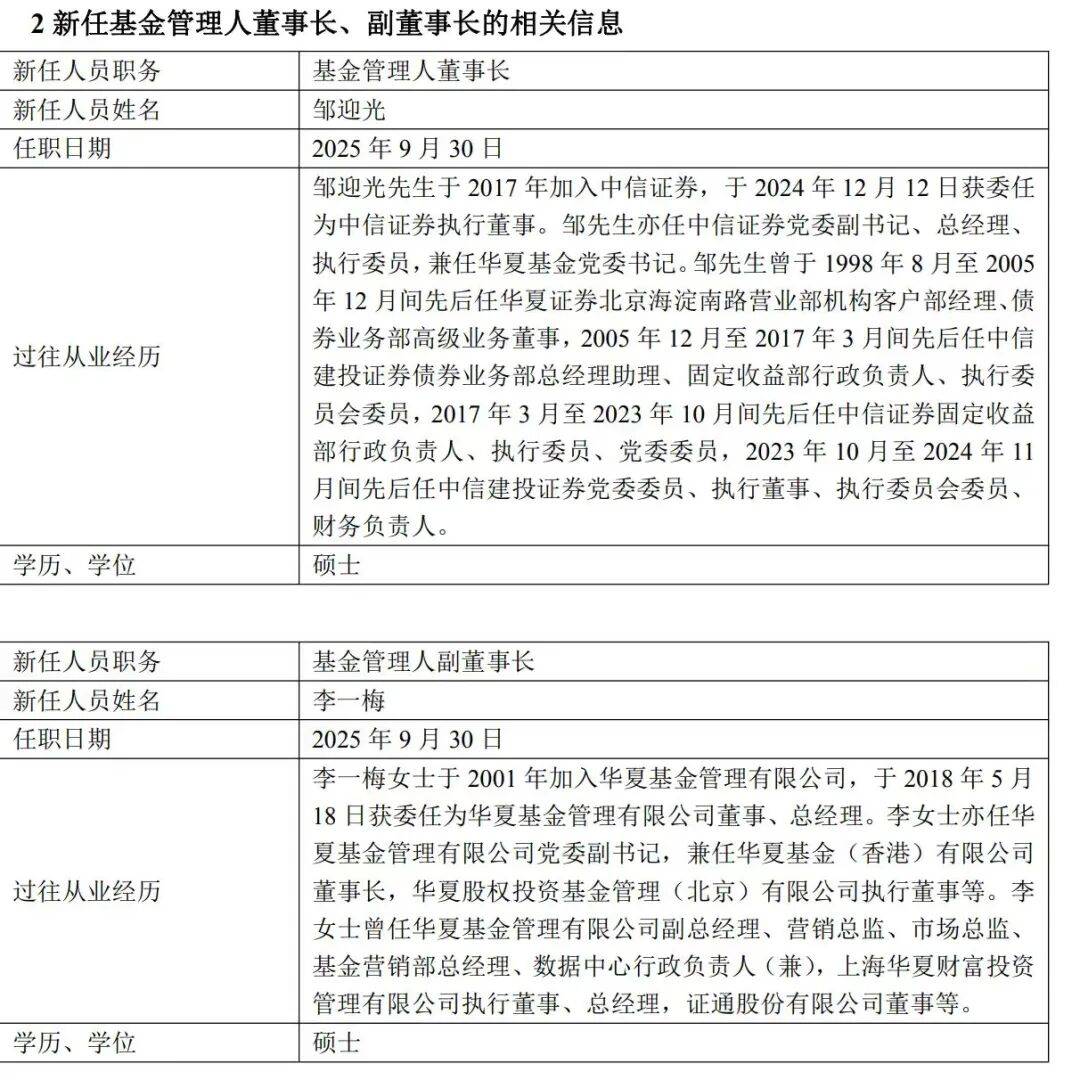邹迎光接任张佑君担任华夏基金董事长,自2025年9月30日生效,目前他还担任中信证券党委副书记、执行董事、总经理、执行委员。同时,华夏基金新任李一梅担任公司副董事长一职。