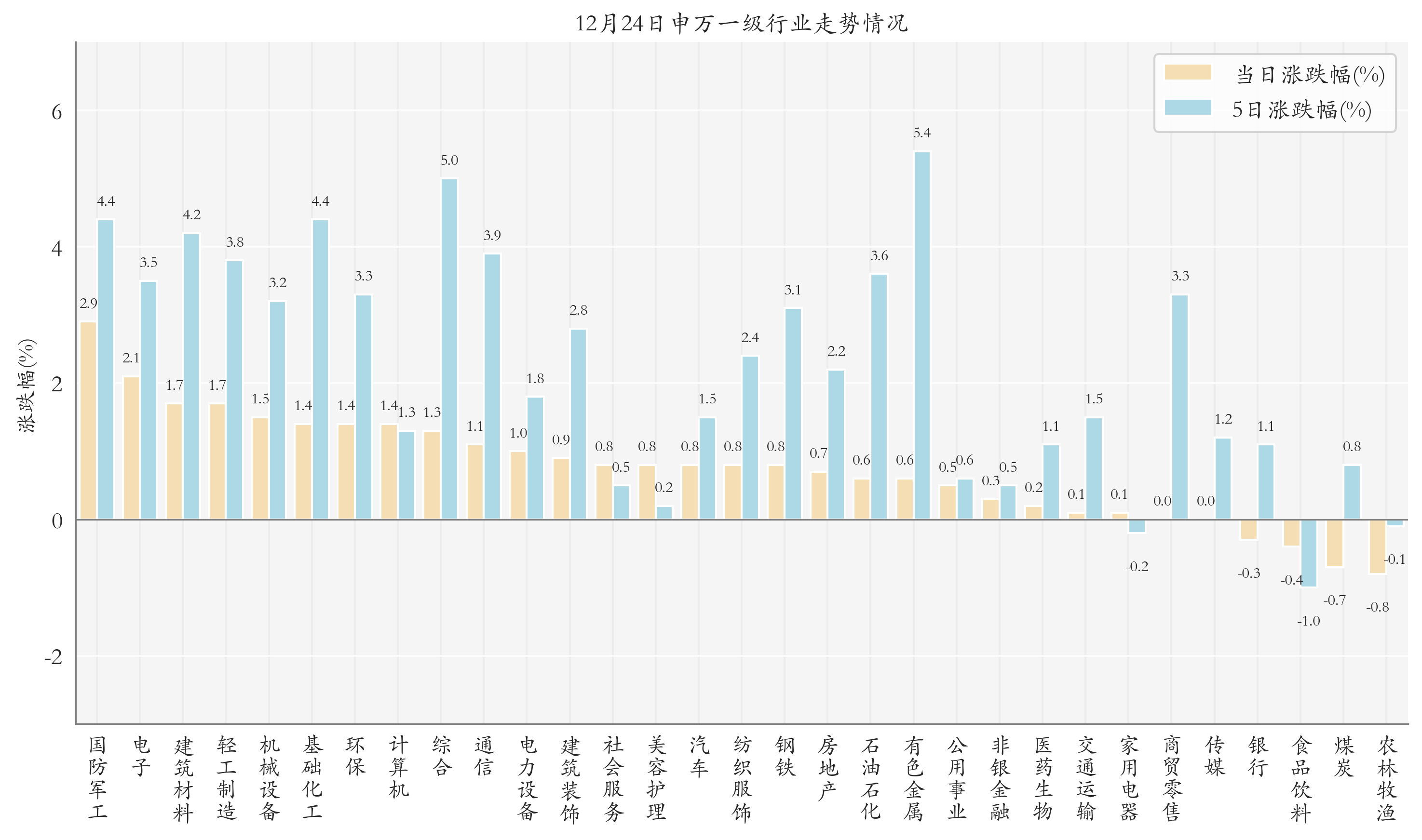 统计今日全部申万一级行业涨跌幅情况,国防军工、电子与建筑材料今日走势排名靠前,日涨跌幅分别为2.88%、2.12%与1.72%,农林牧渔、煤炭与食品饮料的走势排名靠后,日涨跌幅分别是-0.85%、-0.7%与-0.36%;近5个交易日有色金属、综合与基础化工的走势排名靠前,近5日涨跌幅分别为5.35%、4.97%与4.4%,食品饮料、家用电器与农林牧渔的走势排名靠后,近5日涨跌幅分别为-1.05%、-0.19%与-0.11%。