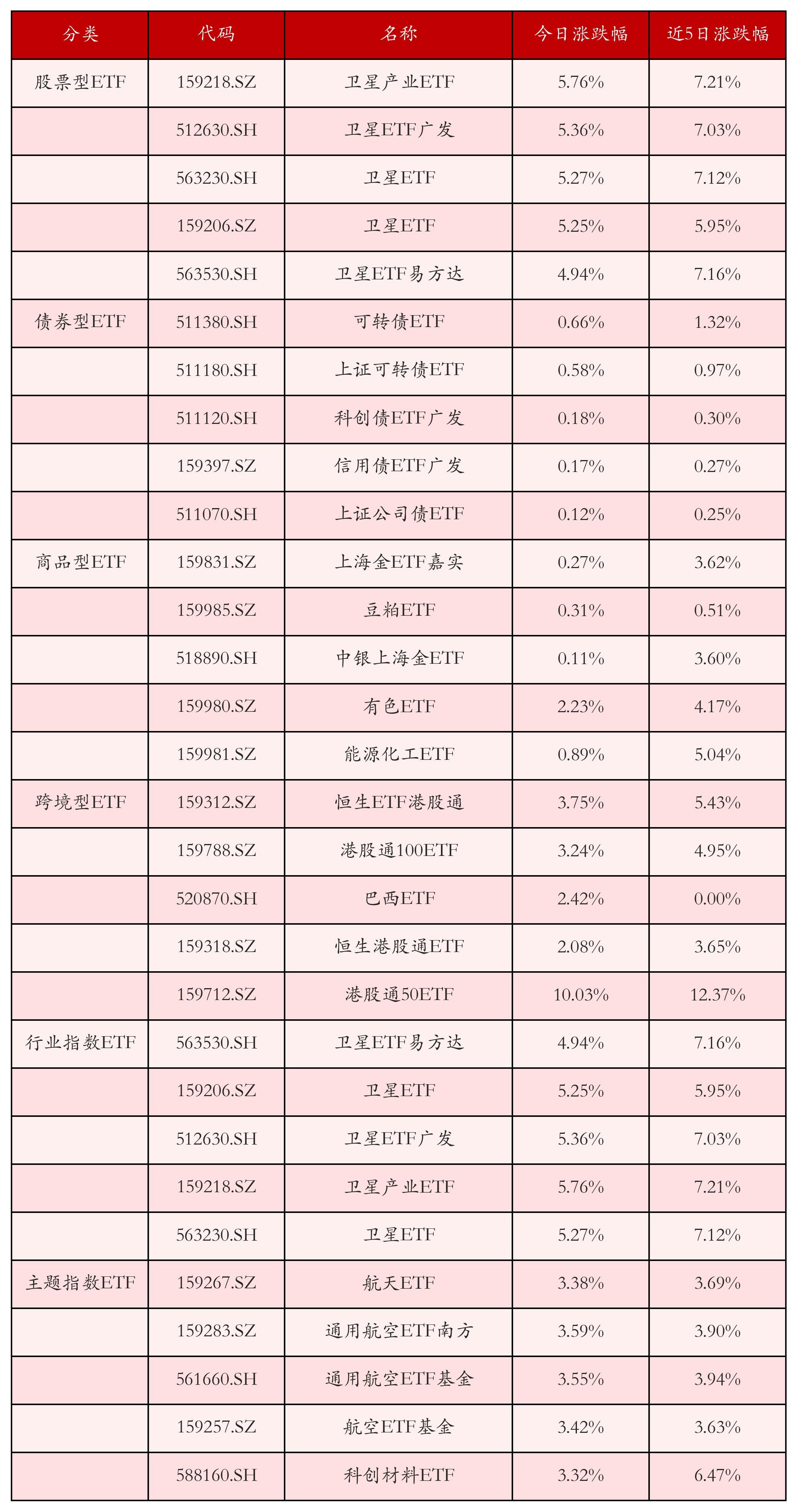 从不同投资种类、行业、主题的ETF产品中找出今日走势行情排名前5的ETF基金,今日涨幅靠前的ETF产品如下表所示。股票型ETF中涨跌幅排名前3位的ETF产品分别为卫星产业ETF(159218.SZ)、卫星ETF广发(512630.SH)和卫星ETF(563230.SH),今日收益率分别为5.76%、5.36%和5.27%。