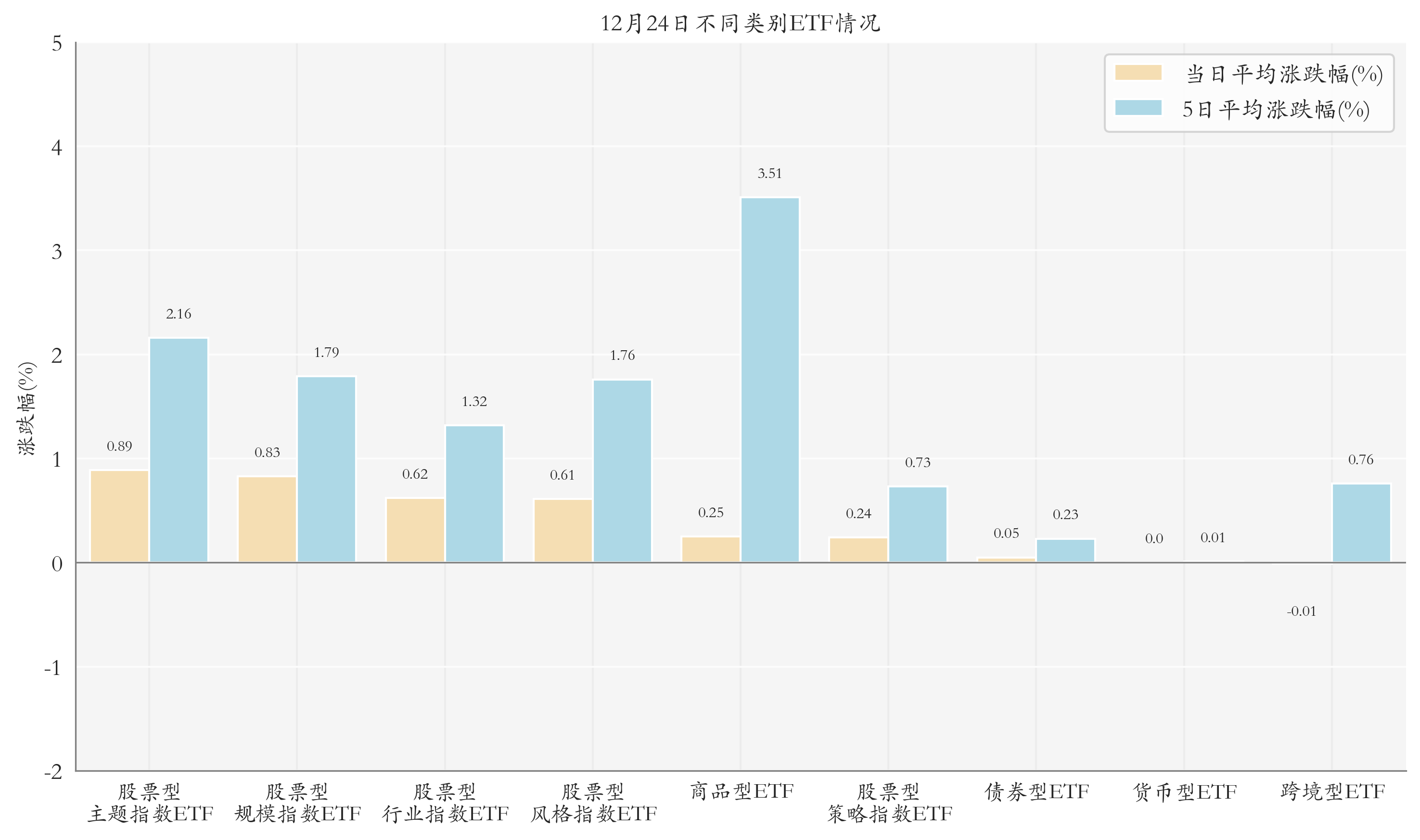 根据ETF基金的规模和涨跌幅计算得出不同分类情况下各类ETF基金的平均涨跌幅。