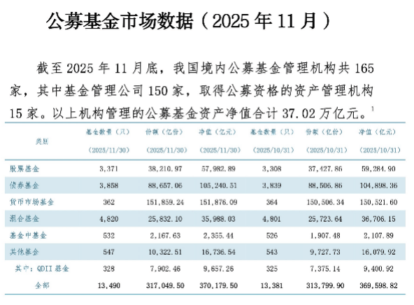 以上机构管理的公募基金资产净值合计37.02万亿元,与10月底的36.96万亿元相比增长580.68亿元。