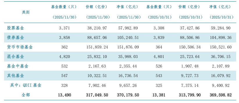 12月29日,中国证券投资基金业协会公布了截至2025年11月末的全市场公募基金数据,在新的统计口径下,股票基金、债券基金、货币市场基金、混合基金、基金中基金、其他基金的份额均实现环比上涨,公募基金资产净值合计已到达37.02万亿元,再次刷新历史新高。