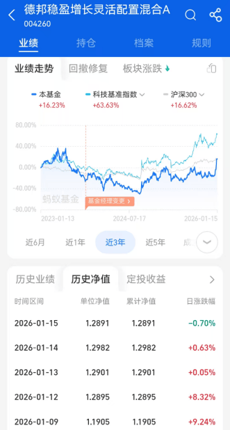 2026年开年,AI应用概念一度接棒商业航天,成为A股最热的投资风口。德邦基金旗下的德邦稳盈增长混合精准踩中这一风口。该基金2025年三季报显示,前十大重仓股市值占基金净值比例高达70.27%,且均为万兴科技、卓易信息、光云科技等AI应用概念股。1月9日,该产品单位净值暴涨9.24%,市场热度持续攀升。