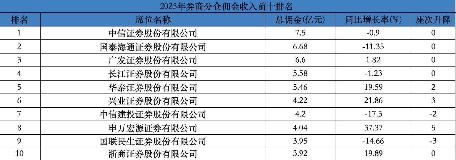 从前十名单来看,中信证券以7.5亿元分仓佣金蝉联榜首,但同比微降0.9%,行业龙头在存量博弈中亦难保持增长。