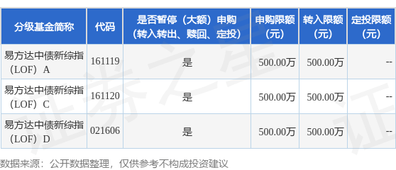 注:(1)根据法律法规和基金合同的相关规定,易方达基金管理有限公司(以下简称“本公司”)决定自2026年4月29日起,易方达中债新综合债券指数发起式证券投资基金(LOF)(场内简称为“易方达新综债LOF”,以下简称“本基金”)A类基金份额、C类基金份额和D类基金份额在全部销售机构暂停机构客户的大额申购及大额转换转入业务,单日单个基金账户在全部销售机构累计申购(含定期定额投资及转换转入,下同)本基金A类基金份额或C类基金份额或D类基金份额的金额不超过500万元(含)。如单日单个基金账户单笔申购本基金A类基金份额或C类基金份额或D类基金份额的金额超过500万元(不含),则500万元确认申购成功,超过500万元(不含)金额的部分将确认失败;如单日单个基金账户多笔累计申购本基金A类基金份额的金额超过500万元(不含)或单日单个基金账户多笔累计申购本基金C类基金份额的金额超过500万元(不含)或单日单个基金账户多笔累计申购本基金D类基金份额的金额超过500万元(不含),则对该类基金份额的申请按照申请金额从大到小排序,基金管理人将逐笔累加至该类基金份额不超过500万元(含)限额的申请确认成功,该类基金份额其余申请金额确认失败。
